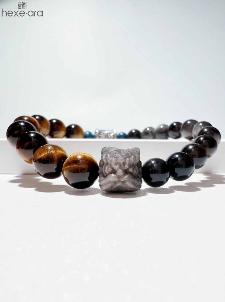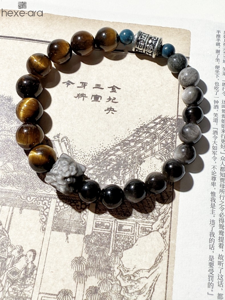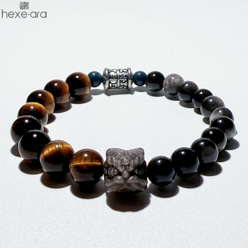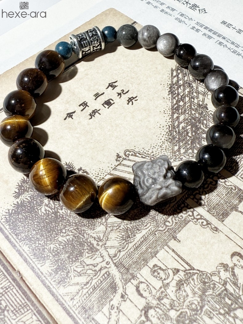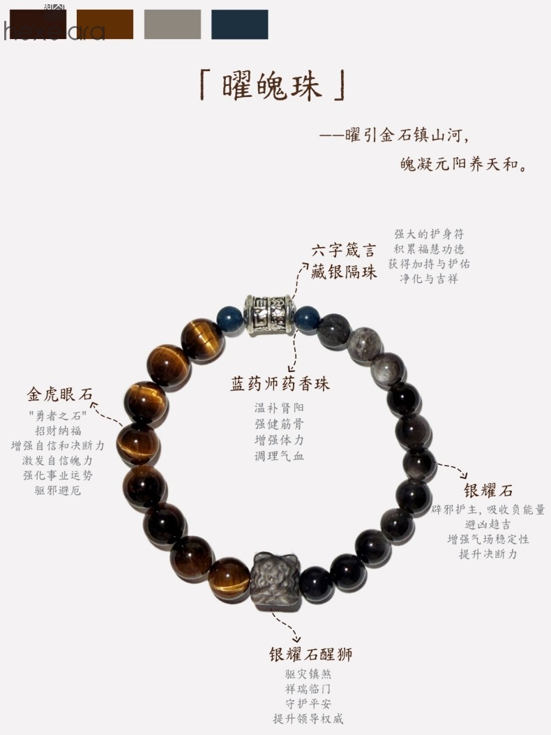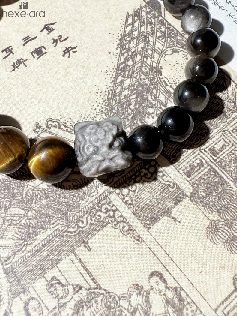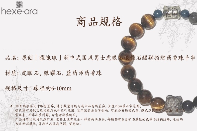 【品名】hexe-ara原创「曜魄珠」新中式国风男士虎眼石银耀石醒狮招财药香珠手串