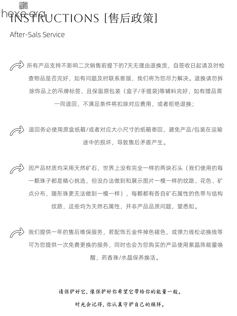 3、因佩戴过程中褪色、变色或其他质量不合格均作为无条件售后范围,可要求进行售后。